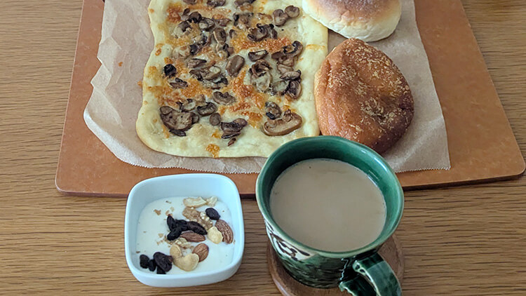 | 昼食 | たまごサンド メロンパン サラダ(大根・しらす・オクラ) |